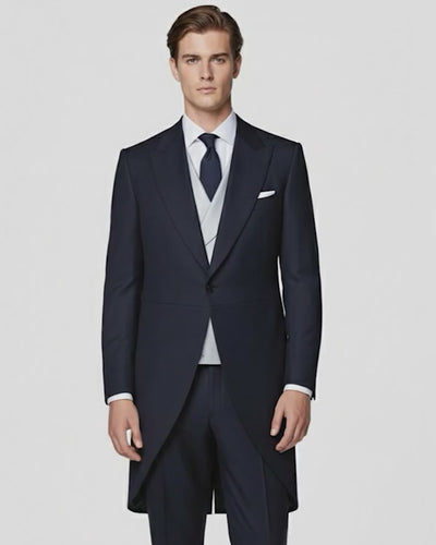 Chaqué de Novio a Medida Azul Marino con Chaleco Gris en Contraste y Solapa Clásica