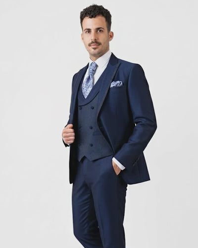 Este traje es perfecto para novios que quieren mantener la elegancia tradicional del azul marino, pero con un toque distintivo gracias al chaleco fantasía. Ideal tanto para bodas de día como de tarde.